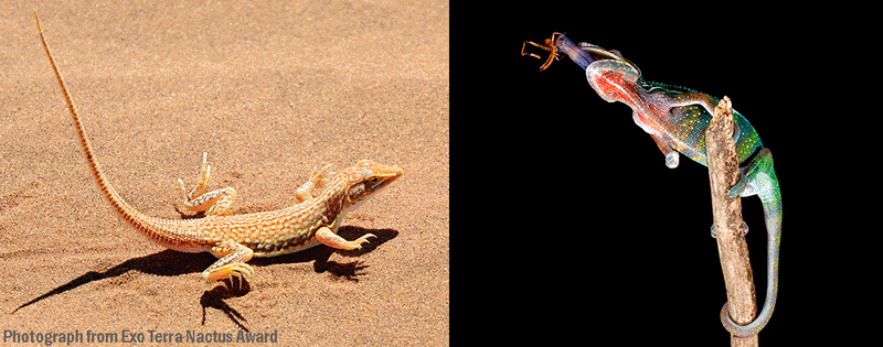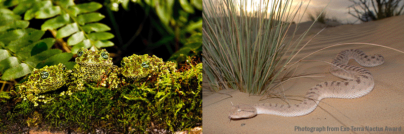 สัตว์เลื้อยคลานในป่าฝนเขตร้อนต้องการใช้อุณหภูมิช่วงกลาง และมีความชื้นสูง ปัจจัยทั้งสองตัวแปรจะต้องมีการควบคุมให้อยู่ในระดับที่เหมาะสมและถูกตรวจสอบอย่างสม่ำเสมอ และในทางตรงกันข้ามสัตว์เลื้อยคลานในทะเลทรายต้องใช้อุณหภูมิสูง แต่ความชื้นต่ำ ต้องการพื้นที่อาบแดดที่มีอุณหภูมิสูงกว่าพื้นที่โดยรอบ