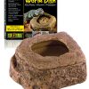 จานใส่อาหาร Exo Terra มีลักษณะพื้นผิวภายนอกที่คล้ายคลึงหินธรรมชาติมาก และพื้นผิมภายในเรียบปราศจากหลุม ผิวถ้วยเคลือบเพื่อป้องกันการสะสมของแบคทีเรียและง่ายต่การทำความสะอาด สีธรรมชาติช่วยให้สามารถตกแต่งร่วมกับสภาพที่เลี้ยงแบบทะเลทราย, ป่าฝน และสภาพสถานที่เลี้ยงแบบอื่นๆ
